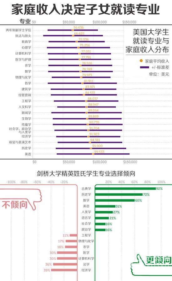 美国康奈尔大学的社会学家Kim Weeden总结了全美的教育数据,发现学生父母的收入水平确实与学生所就读的专业有关联,即高收入家庭的孩子更倾向选择历史、文学、表演等文科专业,而低收入家庭的孩子出于就业回报等考虑,则更多选择实用性更强的计算机、物理等理工科专业。当然,统计数据也确实表明如计算机专业出身的学生将来的年平均收入会比人文专业出身的学生高2.5万美元。