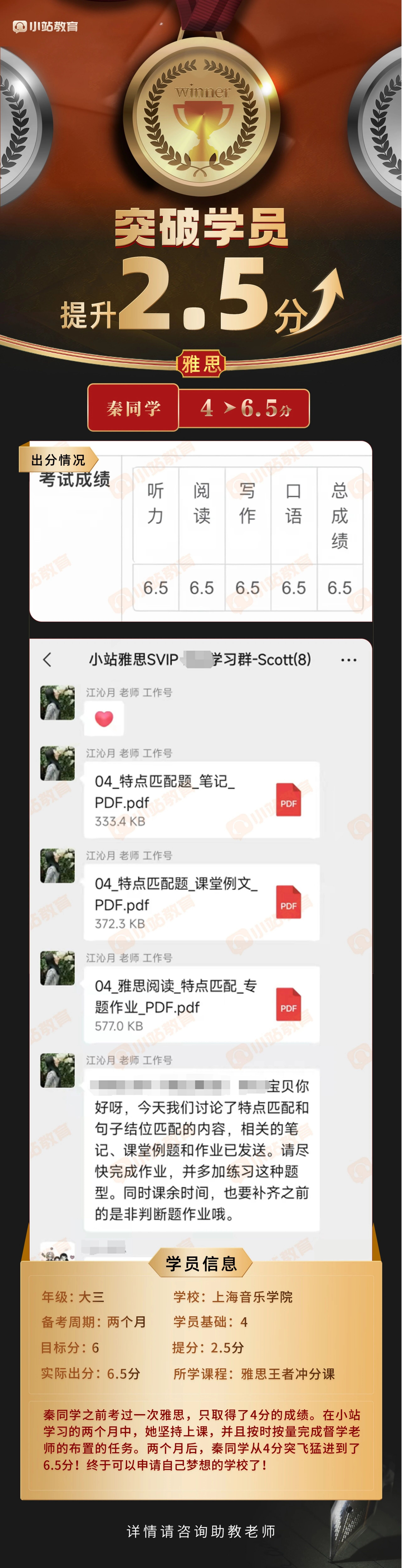 小站雅思系列课程的提分率高达97.45%,远高于30%的自学提分率!往期课程出分案例有图有真相~